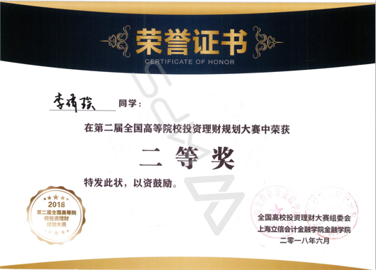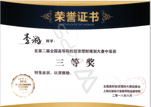 6月3日,第二届全国高等院校投资理财规划大赛在上海立信会计金融学院举行,比赛共有来自西南政法大学、广东财经大学、上海立信会计金融学院等全国20多个省市的33所高校130余名学生参加。我校经济学院金融系刘欣老师带领4名学生代表学校参加了比赛。经过激烈争夺,最终我校参赛团队获得团体二等奖,李雅馨获得一等奖,李清瑶获得二等奖,李游、詹媛媛获得三等奖。